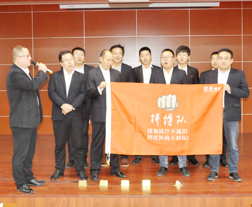 4月3日,安博官方网页版营销誓师大会在营销中心热血开展! 全员参与,激情动员,安博官方网页版销售精英们组成十个战队,并确立自己的队长、队名、队旗、队标及队呼。在大会上各战队“亮队型、展风彩、表决心”,队员们慷慨激昂的表态发言,点燃了营销人员的满腔热情。